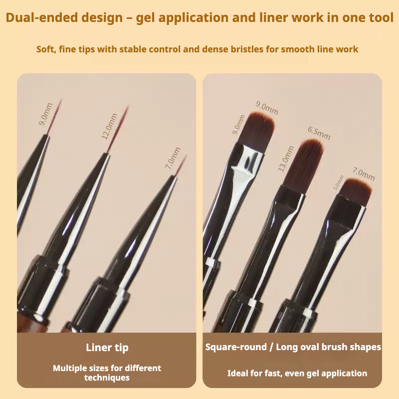 A versatile dual-ended nail brush designed to handle both gel application and fine liner work...