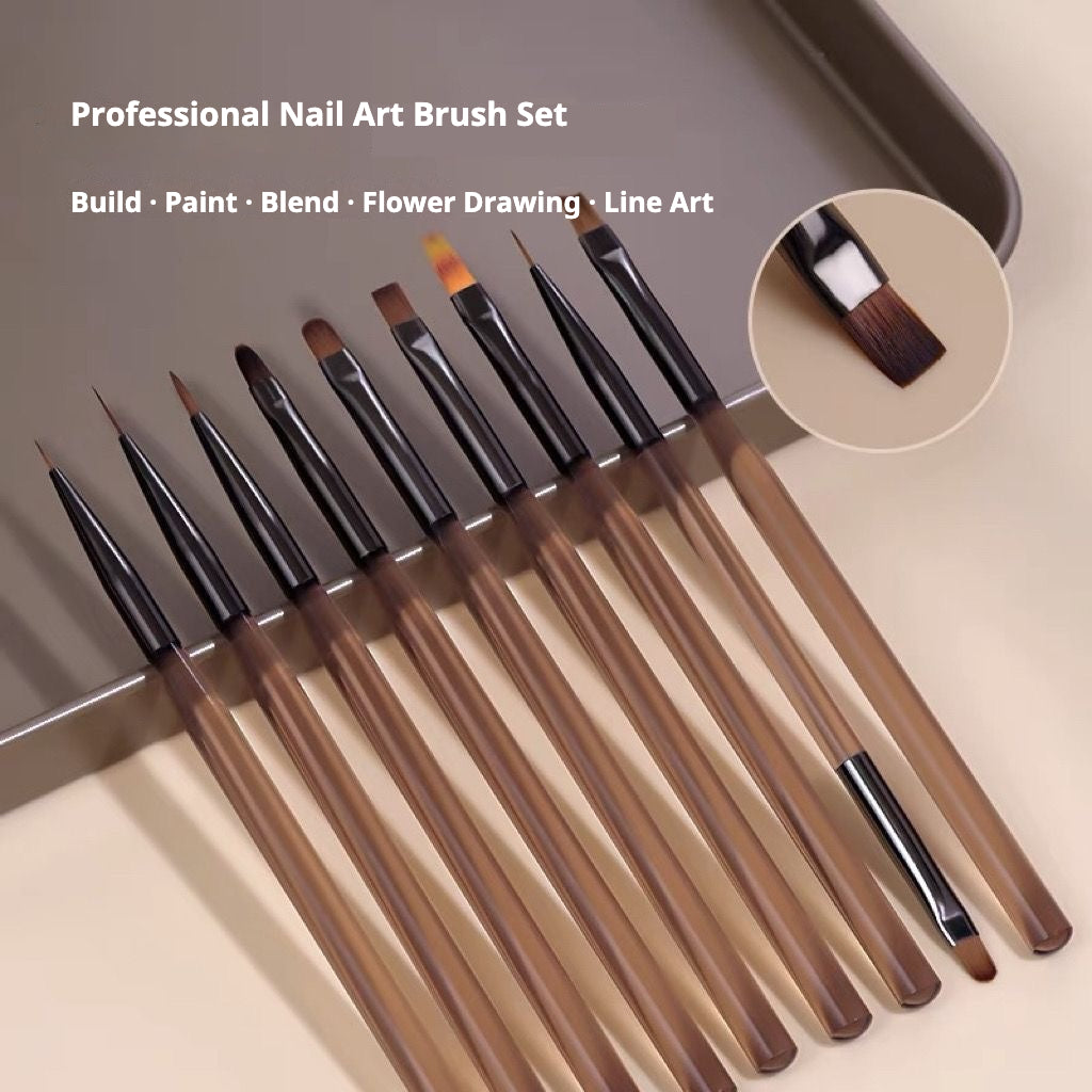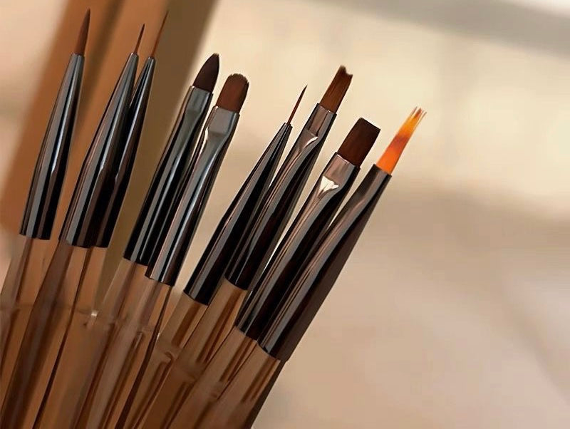 A versatile nail art brush set covering detailed lines, gradients, overlays and gel application.