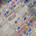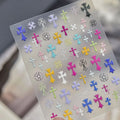 Sweet macaron tones meet edgy chrome cross details. These embossed nail stickers feature colorful cross motifs in a soft pastel palette, perfect for Y2K, punk, or soft-girl nail designs. Two styles available (CF-1560 / CF-1559).