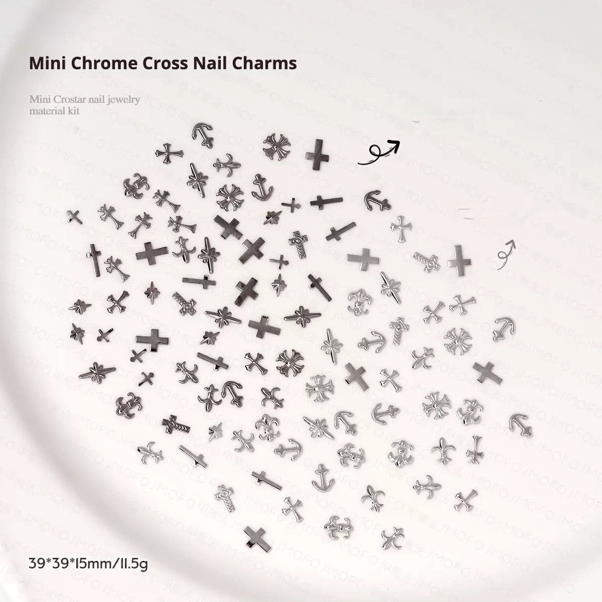 Mini chrome cross embellishments for edgy, gothic-inspired nail designs. Lightweight and thin (not alloy), perfect for layering without bulk.