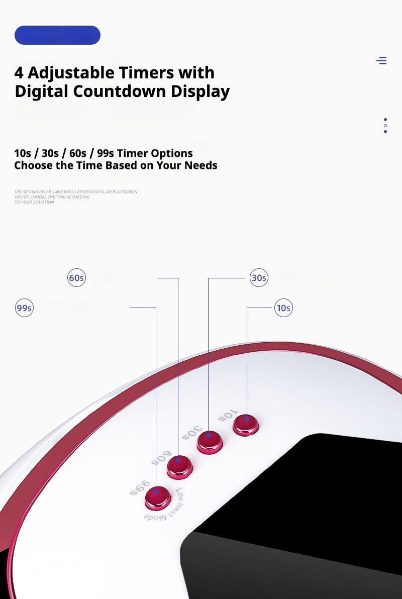 With four adjustable timer settings and a clear digital countdown display, you can easily select curing times based on gel type and nail thickness. The smart sensor system ensures smooth workflow and consistent results, whether in a salon or at home.